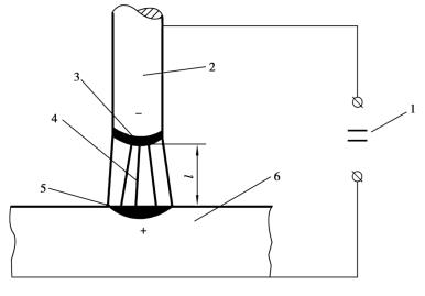 1—電源(直流) 2—焊條 3—陰極區4—弧柱 5—陽極區 6—工件